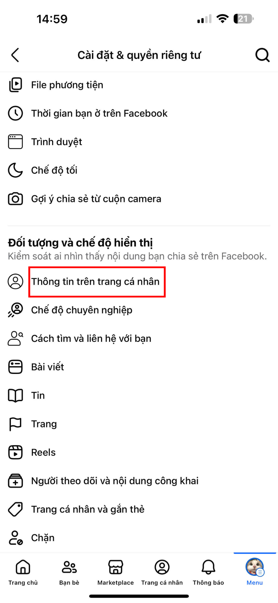 Bước 7: Bạn có thể quay trở lại giao diện Cài đặt trên ứng dụng Facebook và chọn vào mục Thông tin cá nhân để kiểm tra lại xem số điện thoại đã được thêm vào thành công hay chưa.