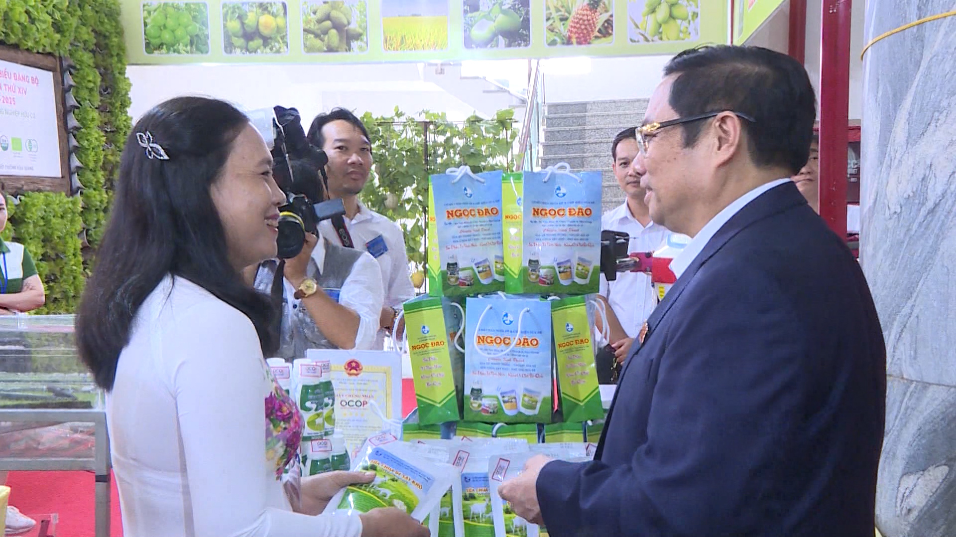 Thủ tướng Chính phủ Phạm Minh Chính tham quan gian hàng sản phẩm OCOP sữa dê Ngọc Đào tại Hội nghị xúc tiến Đầu tư tỉnh Hậu Giang 2022.