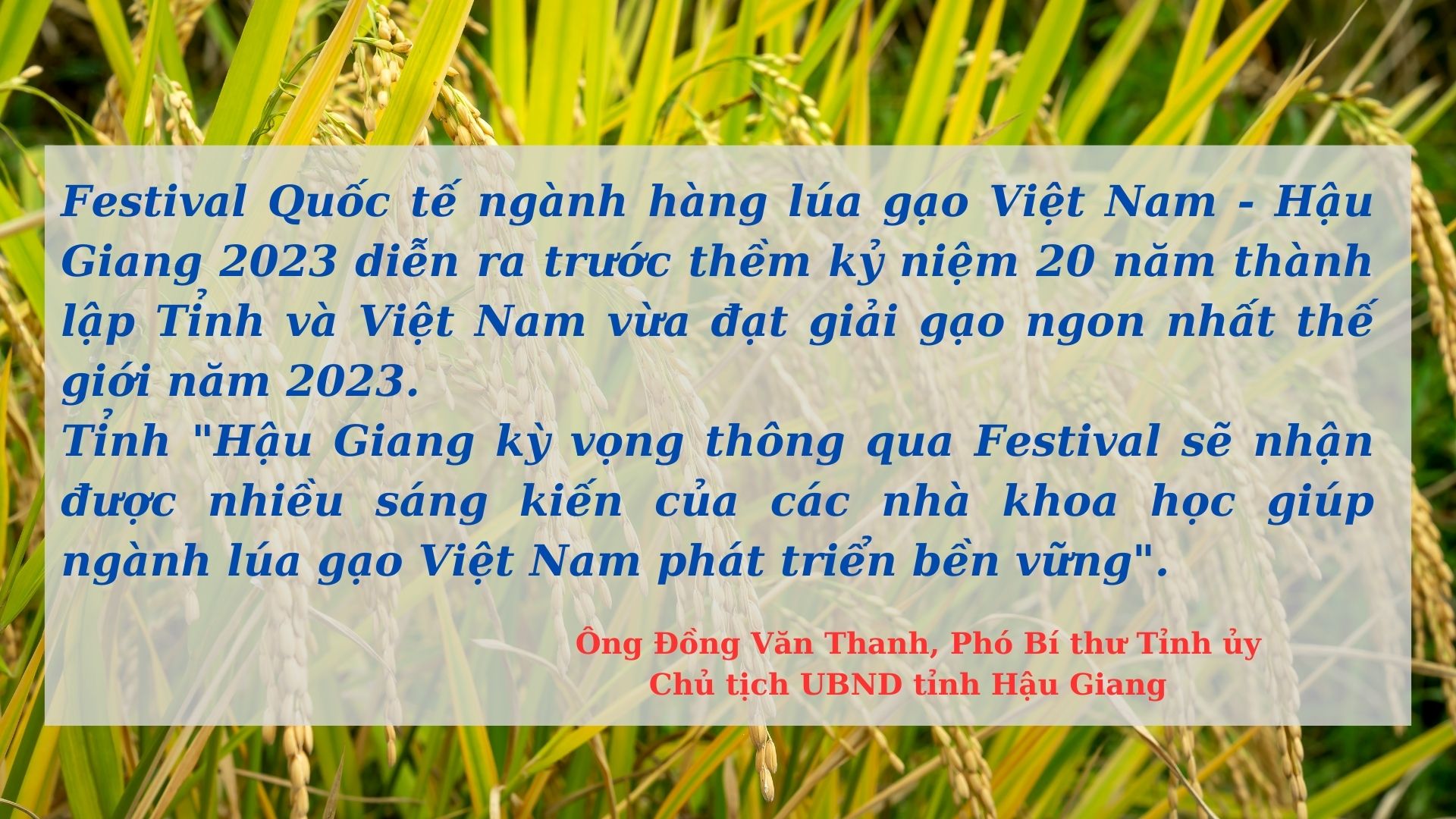 Thúc đẩy phát triển sản xuất lúa gạo chất lượng cao, nâng cao chuỗi giá trị, lấy tăng trưởng xanh làm nền tảng và thích ứng với biến đổi khí hậu, Thủ tướng Chính phủ giao Bộ Nông nghiệp và Phát triển nông thôn chủ trì, phối hợp với UBND tỉnh Hậu Giang và các Bộ, Ngành liên quan tổ chức Festival Quốc tế ngành hàng lúa gạo Việt Nam – Hậu Giang 2023, với chủ đề “Green Rice for Life – Gạo Xanh, Sống Lành”.