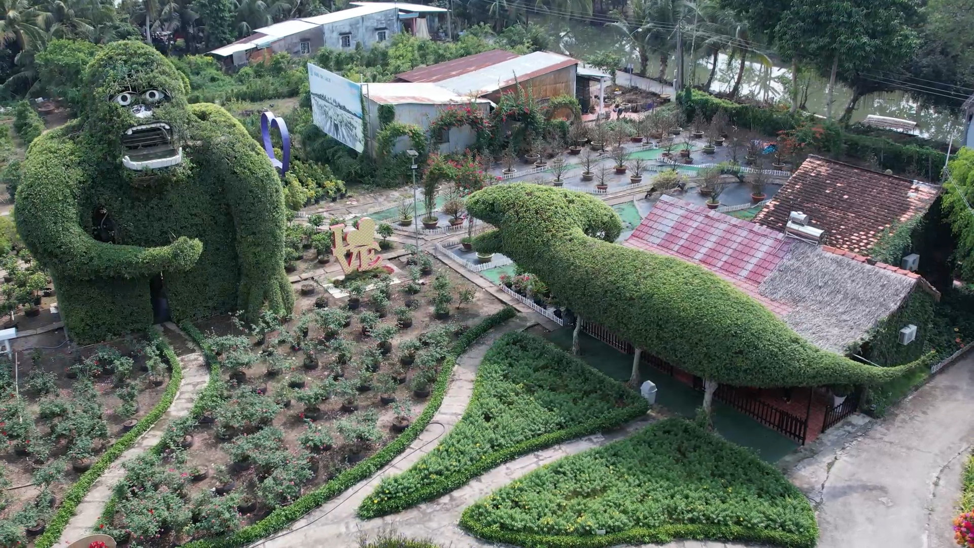 Đứng trên tác phẩm King Kong, du khách phóng tầm mắt chiêm ngưỡng toàn cảnh khu du lịch rộng hơn 3 hecta, một không gian xanh mát và tràn đầy sức sống. Anh Lộc cho biết để hoàn thiện tác phẩm này, anh cùng 10 thợ lành nghề miệt mài làm việc suốt 2 tháng, từ dựng khung cho đến chăm chút từng chi tiết cây xanh, biến King Kong trở thành biểu tượng độc đáo và sống động của khu vườn.