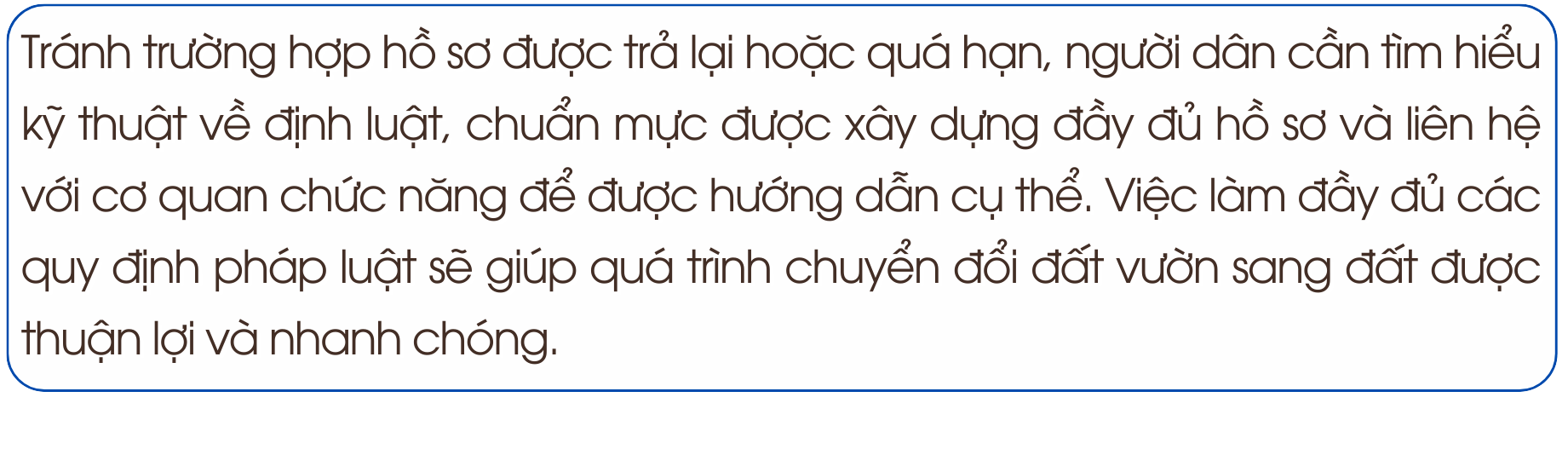 Bước quan trọng nhất trong quá trình chuyển đổi là tiền sử dụng đất. Thời gian giải quyết hồ sơ tối đa là 15 ngày (vùng thường) hoặc 25 ngày (vùng miền núi, hải đảo, vùng sâu, vùng xa, vùng có điều kiện kinh tế – xã hội khó khăn).