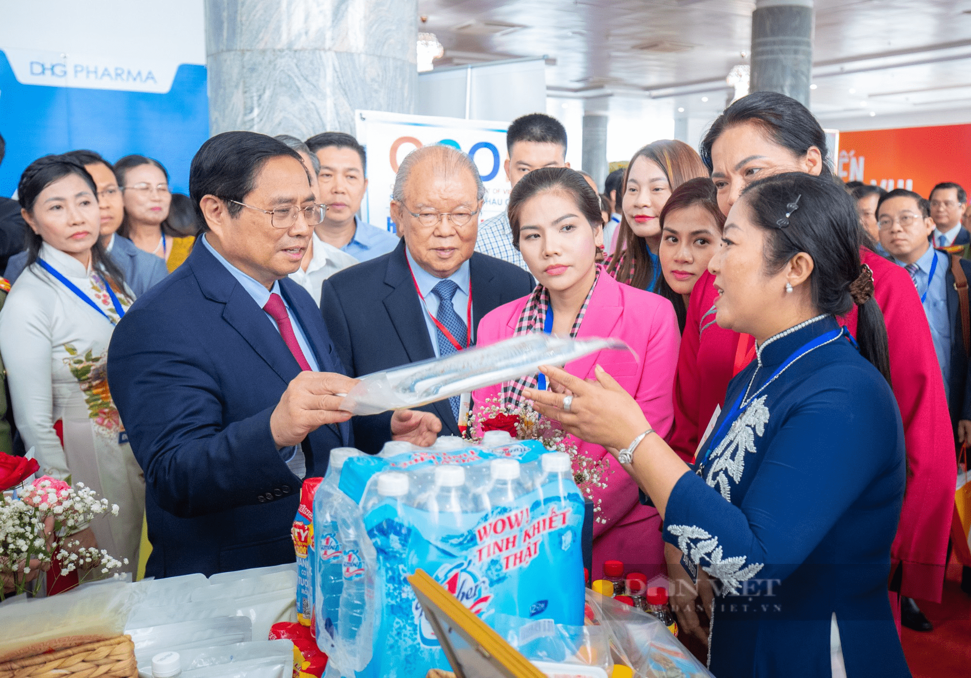 Thủ tướng Chính phủ Phạm Minh Chính tham quan, nghe chị Nguyễn Kim Thùy (bìa phải) giới thiệu sản phẩm tại gian hàng Hợp tác xã Kỳ Như trưng bày tại Hội nghị xúc tiến đầu tư tỉnh Hậu Giang năm 2022.