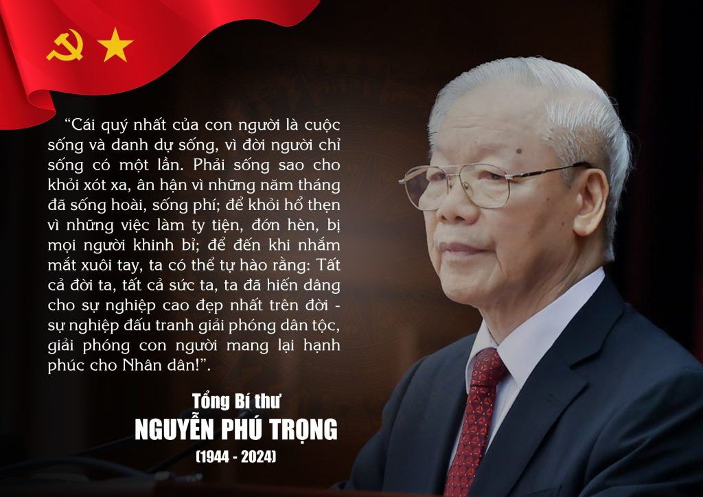 Đồng chí mất đi là một tổn thất to lớn đối với Đảng, Nhà nước, nhân dân ta và gia quyến Đồng chí. Để tỏ lòng tiếc thương và tưởng nhớ đồng chí Tổng Bí thư Nguyễn Phú Trọng, Ban Chấp hành Trung ương Đảng Cộng sản Việt Nam, Quốc hội nước Cộng hoà xã hội chủ nghĩa Việt Nam, Chủ tịch nước Cộng hoà xã hội chủ nghĩa Việt Nam, Chính phủ nước Cộng hoà xã hội chủ nghĩa Việt Nam, Uỷ ban Trung ương Mặt trận Tổ quốc Việt Nam quyết định tổ chức tang lễ đồng chí Tổng Bí thư Nguyễn Phú Trọng với nghi thức Quốc tang.