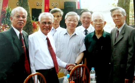 Tổng Bí thư Nguyễn Phú Trọng và các thầy giáo: Nguyễn Duy Ninh, Đoàn Thanh, Vũ Huy Đông, Trần Thái Bình. Ảnh Tư liệu