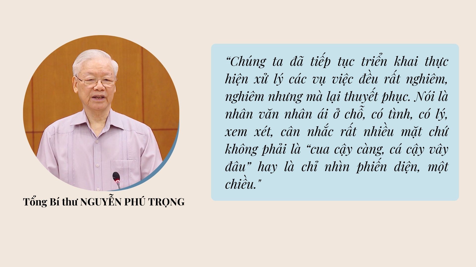 Những câu nói của Tổng Bí thư được nhắc lại trong nhiều bài viết của cuốn sách. Đây cũng là một trong những nội dung thể hiện quan điểm của người đứng đầu Đảng, Nhà nước đối với cán bộ, nghiêm minh, nhưng cũng rất nhân văn, là cái tâm, cái tầm của người lãnh đạo. Xử lý kỷ luật cán bộ phải kết hợp với xây dựng đội ngũ cán bộ, xây là chính, tạo môi trường khích lệ cán bộ làm việc.