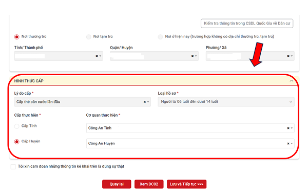 – Trường hợp công dân chọn nơi thực hiện là đội Cảnh sát QLHC về TTXH Công an huyện/thị xã/thành phố nơi thương trú/tạm trú: Tại cấp thực hiện chọn “Cấp huyện”, cơ quan thực hiện phía trên chọn “Công an tỉnh … ”, phía dưới chọn “Công an huyện/thị xã/ thành phố” nơi thường trú/tạm trú.