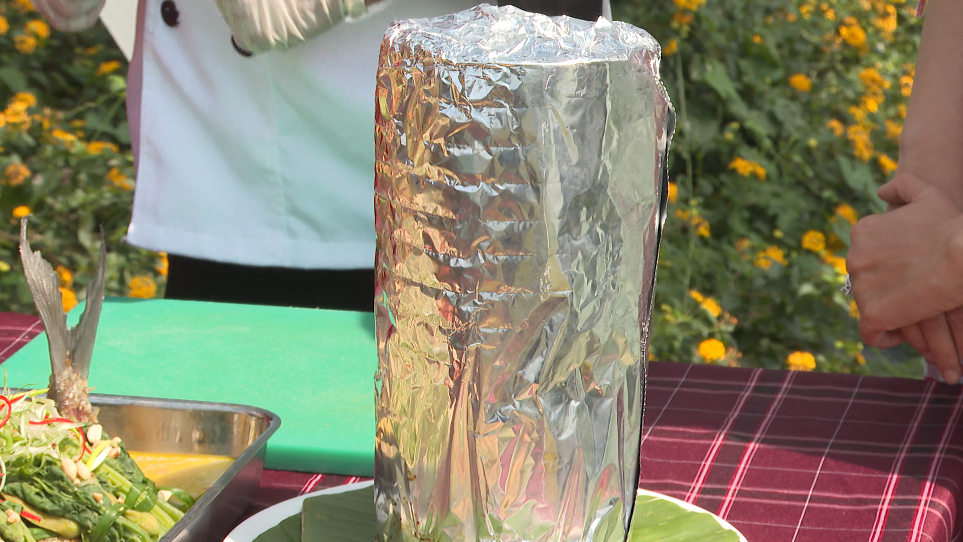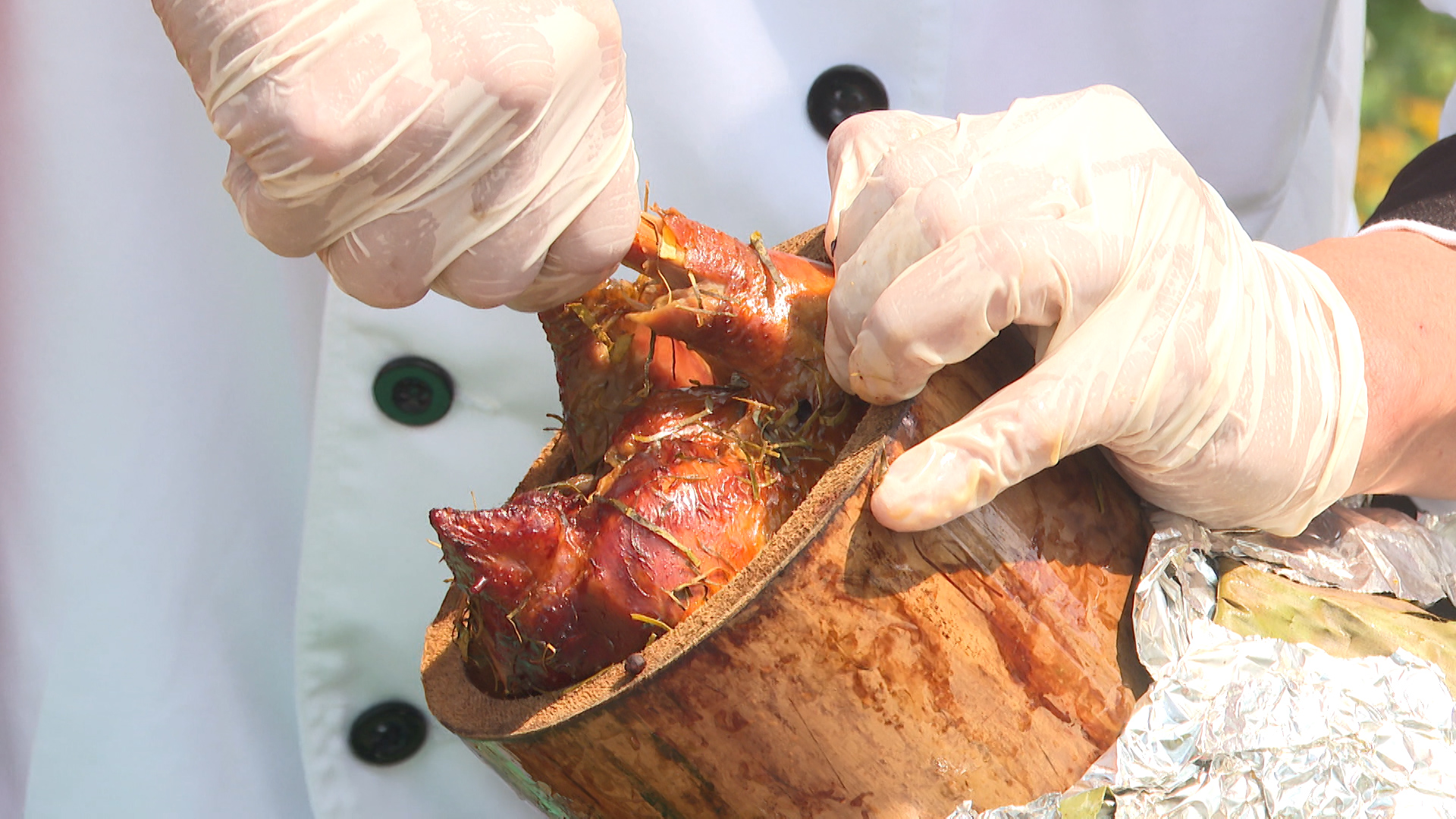 Đảm bảo món Gà Nướng Ống Tre đạt được hương vị hoàn hảo nhất, trước khi nướng, ống tre sẽ được bọc một lớp giấy bạc bên ngoài.