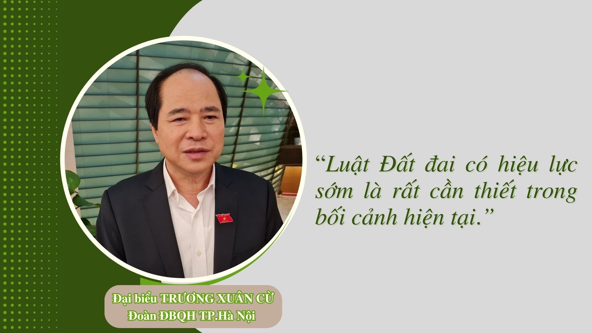 Theo đại biểu: “Luật đất đai là bộ luật rất khó. Trong Luật Đất đai trước đây, một số phương pháp xác định giá đất để đền bù, kể cả các vấn đề đấu thầu có những vấn đề tồn tại, dẫn đến những sai phạm, bất cập. Đại biểu Trương Xuân Cừ nêu rõ, Luật Đất đai có hiệu lực sớm là rất cần thiết trong bối cảnh hiện tại.”