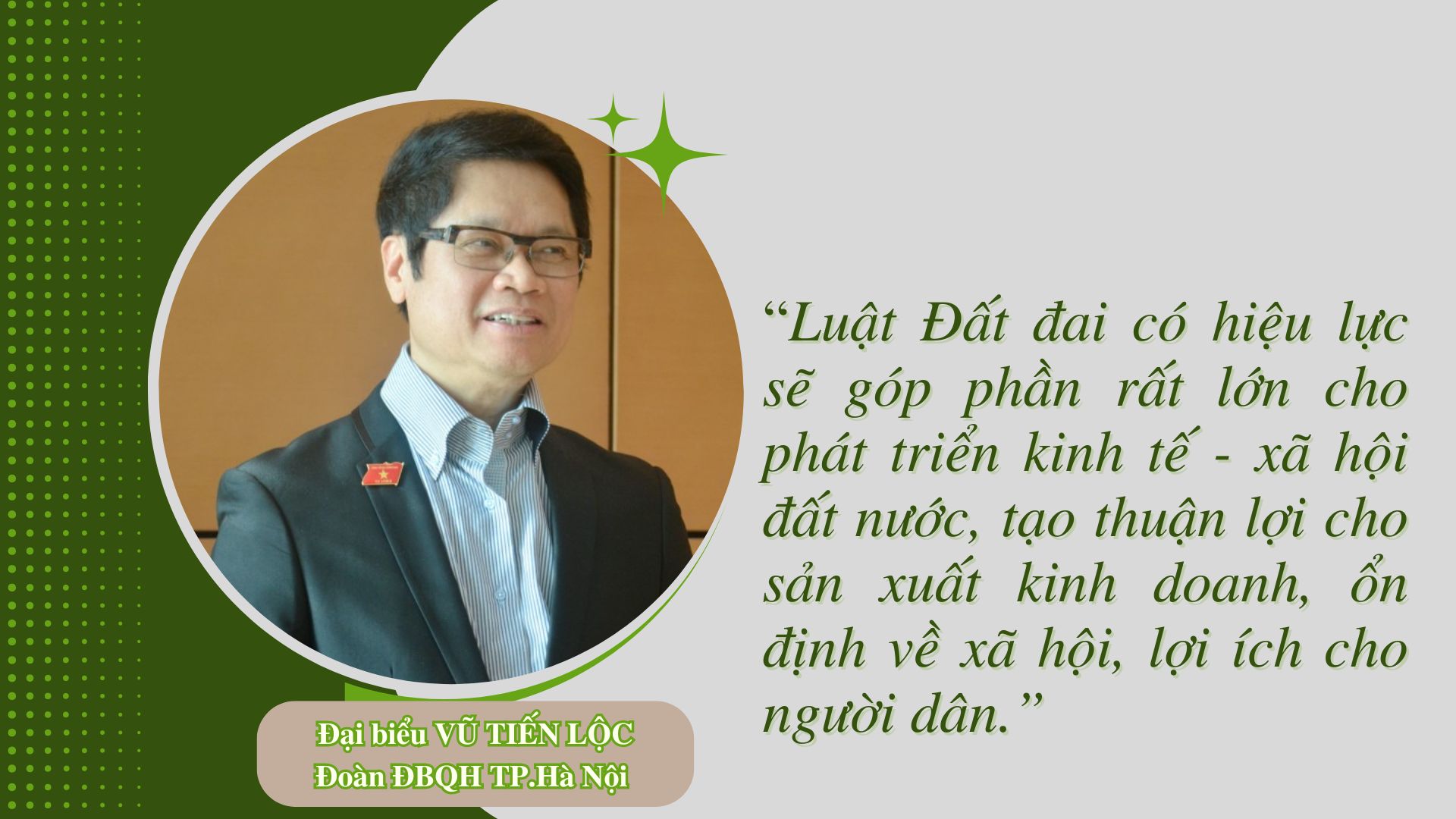 Theo Quochoi.vn, chia sẻ quan tâm đến vấn đề này, đại biểu Vũ Tiến Lộc, Đoàn ĐBQH TP.Hà Nội cho rằng: “ Hiện nay một trong những điểm nghẽn lớn nhất có liên quan đến Luật Đất đai. Do đó, với những sửa đổi luật rất tích cực vừa qua, nếu sớm được nửa năm đưa vào thi hành sẽ có lợi rất lớn cho phát triển kinh tế – xã hội đất nước, tạo thuận lợi cho sản xuất kinh doanh, ổn định về xã hội, lợi ích cho người dân.” Đại biểu Vũ Tiến Lộc nêu rõ, nửa năm là thời gian rất quý giá và sẽ tạo ra động lực để thúc đẩy tăng trưởng nền kinh tế.