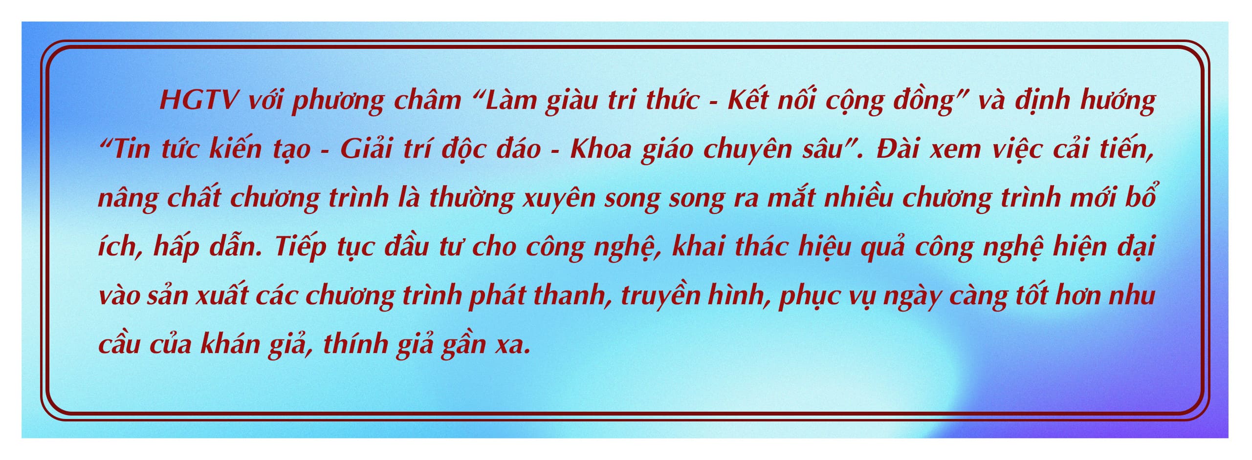 Khán giả, thính giả yêu mến HGTV không vì các gameshow hoành tráng mà bởi những thông tin thiết thân với cuộc sống được truyền tải chuẩn xác, đầy đủ qua góc nhìn độc đáo, chân tình đậm chất miền Tây. Đáp lại tình cảm này, Đài không ngừng sáng tạo giá trị mới nhưng luôn kiên định mục tiêu làm giàu tri thức và kết nối cộng đồng, kiến tạo những tư duy mới, cách làm hay, góp phần tích cực cùng tỉnh Hậu Giang và vùng đất chín Rồng hiện thực hóa khát vọng phát triển, cất cánh vươn xa.